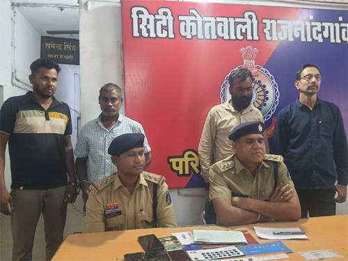 पुलिस अधीक्षक मोहित गर्ग के निर्देश एवं अतिरिक्त पुलिस अधीक्षक राहुल देव शर्मा तथा नगर पुलिस अधीक्षक पुष्पेन्द्र नायक राजनादगांव के मार्गदर्शन एवं थाना प्रभारी निरीक्षक रामेन्द्र सिंह के नेतृृत्व मे आरोपियों के पतासाजी हेतु थाना कोतवाली से तत्काल टीम गठित कर आरोपियों के पते पर रवाना कर आरोपी प्रफुल्ल जैन पिता उत्तम चंद जैन, उम्र-52 साल, निवासी-रामाधीन मार्ग, कमल टाकिज के सामने, थाना सिटी कोतवाली, जिला-राजनांदगंाव, लोमश देवांगन पिता स्व. विष्णुराम देवांगन, उम्र-43, साकिन-शंकरपुर, थाना-कोतवाली, जिला राजनांदगंाव, विजय साहू पिता बसंत साहू, उम्र-32 साल, निवासी-अपोलो कॅालेज के पीछे, शिवा कालोनी, पुलिस चौकी-अंजोर, थाना-पुलगांव, जिला-दुर्ग, मयंक शुक्ला पिता श्यामाचरण शुक्ला, उम्र-30 साल, निवासी-बांधे कालोनी, पोस्ट बांधे, तहसील-पखंाजुर, थाना-बांधे, जिला-कांकेर हॉल ग्रीन वैली ए-5, फर्स्ट फ्लोर, रूम नंबर 2, जुनवानी, थाना-स्मृति नगर, भिलाई, जिला-दुर्ग को मुखबीर की सूचना पर घेराबंदी कर पकड़ा गया, जिसे थाना लाकर पूछताछ करने पर प्रार्थी के साथ पोस्ट ऑफिस में नौकरी लगाने के नाम पर 400000 रूपये लेकर फर्जी नियुक्ति पत्र एवं आईडी कार्ड देकर धोखाधड़ी करना स्वीकार किये। जिनके कब्जे बताये। आरेापी प्रफुल्ल जैन पंजाब नेशनल बैंक एवं भारतीय स्टेट बैंक का पास बुक, एक नग ओप्पो कंपनी का मोबाईल, चार नग रजिस्टर्ड लिफाफा खुला हुआ जिसमें तीन लिफाफा में रजिस्टर्ड डाक का स्टीकर और एक में स्पीड पोस्ट का स्टीकर लगा, लोमेश देवांगन के कब्जे से एक नग मोबाईल और आईडीबीआई बैंक का पासबुक विजय साहू के कब्जे से एक नग मोबाईल, बैंक ऑफ बडौदा एवं बैंक ऑफ इंडिया का पास बुक पेश करने पर जप्त कर कब्जा पुलिस लिया गया। ओरोपीगणों द्वारा सरकारी नौकरी लगवाने का झांसा देकर फर्जी निुयक्ति पत्र, आईडी कार्ड कुटकरण एवं प्रतिरूपण द्वारा तैयार कर धोखाधडी करने की नीयत से प्रार्थी को देना पाये जाने से प्रकरण में धारा 419, 467, 468, 471, भादंवि जोड़ी गयी है। जुर्म अजमानतीय होने से विधिवत गिरफ्तार कर आज दिनांक 12.03.2025 को न्यायिक रिमांड पर माननीय न्यायालय पेश किया गयाए आरोपियों का जेल वारंट प्राप्त होने पर जिला जेल राजनांदगांव में दाखिल किया गया।