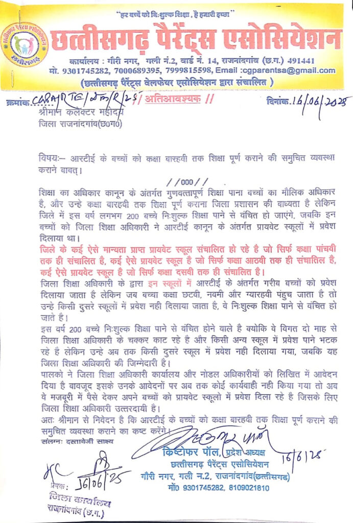 छत्तीसगढ़ पैरेंट्स एसोसिएशन के प्रदेश अध्यक्ष क्रिष्टोफर पॉल ने बताया कि शहर में लगभग 100 आरटीई बच्चों की यही स्थिति है। इन बच्चों को समय पर अन्य स्कूलों में स्थानांतरित नहीं किया जा रहा, और विभाग के जिम्मेदार अधिकारी पूरी तरह से उदासीन बने हुए हैं। श्री पॉल ने कहा कि शिक्षा बच्चों का मौलिक अधिकार है, और इससे वंचित करना गंभीर अपराध की श्रेणी में आता है। शिक्षा विभाग ने शिक्षा का अधिकार कानून को मजाक बना दिया है। अधिकारियों की लापरवाही और संवेदनहीनता के चलते गरीब बच्चों का भविष्य अंधकार में जा रहा है।