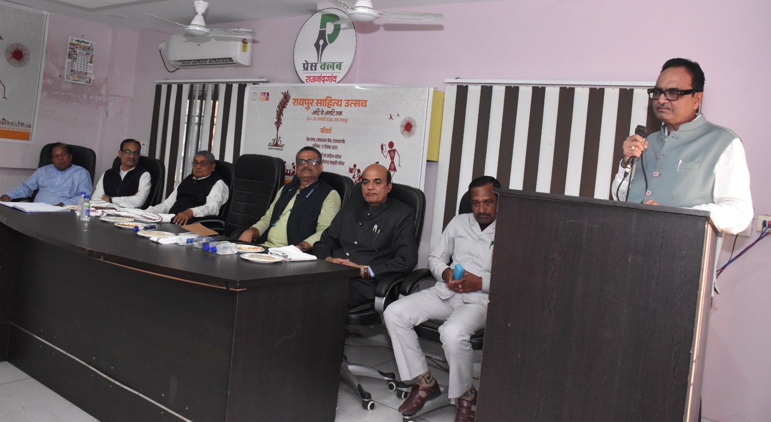 राजनांदगांव। नवा रायपुर में 23 से 25 जनवरी 2026 तक आयोजित होने वाले रायपुर साहित्य उत्सव : आदि से अनादि तक को लेकर शनिवार को प्रेस क्लब में परिचर्चा आयोजित की गई। आयोजन नांदगांव संस्कृति एवं साहित्य परिषद तथा साहित्य अकादमी, छत्तीसगढ़ संस्कृति परिषद के संयुक्त तत्वावधान में हुआ। कार्यक्रम के मुख्य अतिथि वरिष्ठ पत्रकार सुशील कोठारी रहे, जबकि अध्यक्षता साहित्य अकादमी के अध्यक्ष शशांक शर्मा ने की। विशिष्ट अतिथि के रूप में पुरातत्वविद डॉ. आरएन विश्वकर्मा, हिंदी विभागाध्यक्ष डॉ. शंकर मुनि राय सहित अनेक साहित्यकार मौजूद रहे।