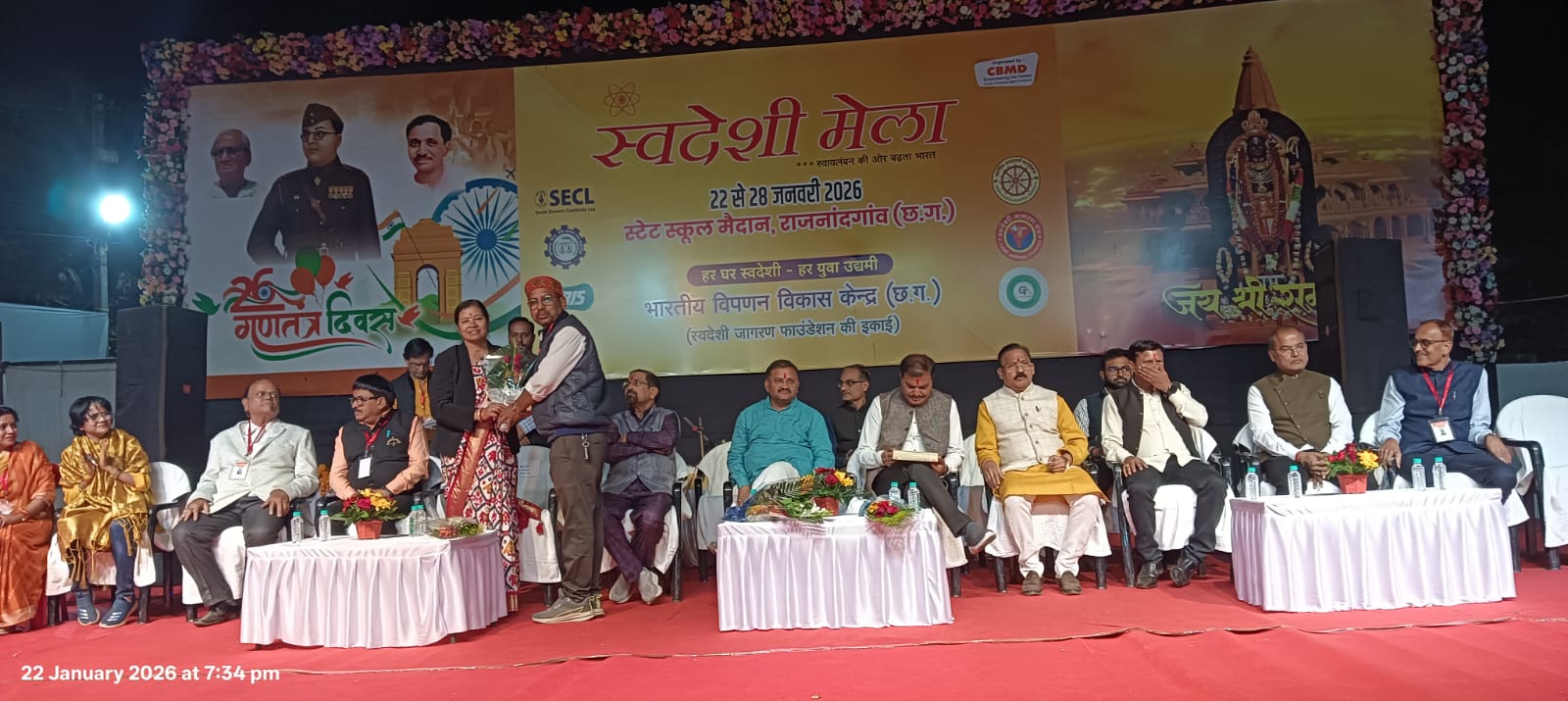 राजनांदगांव। स्टेट स्कूल मैदान में 22 से 28 जनवरी 2026 तक आयोजित स्वदेशी मेला “स्वावलंबन की ओर बढ़ता भारत” का भव्य शुभारंभ हर्षोल्लास के साथ हुआ। उद्घाटन समारोह 22 जनवरी को सायं 6 बजे गरिमामय वातावरण में संपन्न हुआ। कार्यक्रम में मुख्य अतिथि सांसद श्री संतोष पांडे रहे, जबकि अध्यक्षता महापौर श्री मधुसूदन यादव ने की।