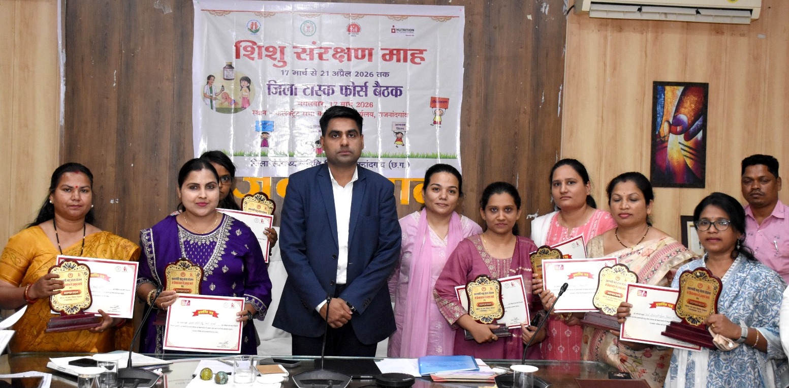 राजनांदगांव। कलेक्टर श्री जितेन्द्र यादव ने आज कलेक्टोरेट सभाकक्ष में प्रधानमंत्री मातृ वंदना योजना अंतर्गत जिले में निर्धारित लक्ष्य से अधिक गर्भवती एवं धात्री महिलाओं का पंजीयन होने पर जिले की सात परियोजनाओं से उत्कृष्ट कार्य के लिए चयनित पर्यवेक्षकों को प्रतीक चिन्ह एवं प्रशस्ति पत्र प्रदान कर सम्मानित किया। कलेक्टर ने राजनांदगांव शहरी परियोजना के चिखली सेक्टर से श्रीमती पार्वती साहू, राजनांदगांव ग्रामीण-1 के सुरगी सेक्टर से श्रीमती दुर्गा जादौन, राजनांदगांव ग्रामीण-2 के घुमका सेक्टर से सुश्री दिशा शिंदे, डोंगरगांव के आरी सेक्टर से श्रीमती बेबी गीतांजली दीवान, डोंगरगढ़ के मेढ़ा सेक्टर से श्रीमती संतोषी राजपूत, छुरिया-1 के रंगीटोला सेक्टर से सुश्री सौम्या चौबे, छुरिया-2 के कुमर्दा सेक्टर से सुश्री वीना यादव को प्रशस्ति पत्र प्रदान कर सम्मानित किया।