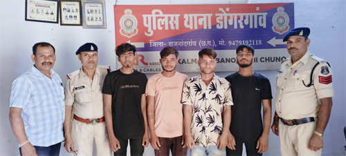 राजनांदगांव। पुलिस अधीक्षक मोहित गर्ग के निर्देश एवं अतिरिक्त पुलिस अधीक्षक राहुल देव शर्मा तथा पुलिस अनुविभागीय अधिकारी डोंगरगांव दिलीप सिंह सिसोदिया राजनांदगांव के मार्गदर्शन एवं थाना प्रभारी डोंगरगांव निरीक्षक उपेन्द्र कुमार शाह के नेतृत्व में थाने में 4 अगस्त को प्रार्थी ने जबानी रिपोर्ट दर्ज कराया कि 5 लोगों के द्वारा मिलकर आपसी रंजिश को लेकर बाहर से लोग बुलाकर तलवार दिखाकर हाथ-मुक्का से मारपीट किये है, जिससे चोंटें आई के रिपोर्ट पर अपराध क्रमांक 199/2024, धारा-296, 118 (1), 190, 191 (2), 191 (3) बीएनएस 25, 27 आर्म्स एक्ट का अपराध कायम कर विवेचना में लिया गया। त्वरित कार्यवाही करते हुये आरोपियों का पता-तलाश कर पकड़ा गया। आरोपी के कब्जे से 1 नग तलवार जप्त किया। आरोपियों छन्नुलाल खरे पिता रामेश्वर खरे, उम्र-25 वर्ष, टीकम खरे पिता रामेश्वर दास खरे, उम्र-20 साल, दोनों निवासी ग्राम कोनारी, थाना-डोगरगांव, करण भारती पिता घनश्याम भारती, उम्र-20 साल, सुखचंद भारती पिता पृथ्वीराज भारती, उम्र 18 वर्ष 2 माह दोनों निवासी ग्राम बांकल, थाना लालबाग के द्वारा दिनांक घटना समय को धारा सदर का घटना कारित करना स्वीकार करने से दिनांक 6 अगस्त को गिरफ्तार कर 7 अगस्त को ज्युडिशियल रिमांड पर भेजा गया है। उक्त कार्यवाही में थाना डोंगरगाव का विशेष भूमिका रही है।
